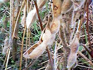畑の大豆の状態は、葉っぱが枯れていて実は熟しています。